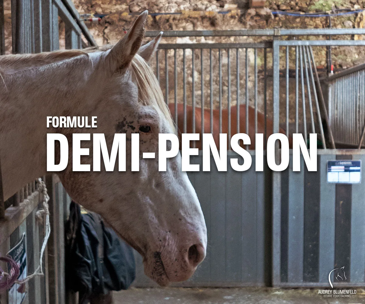 La formule demi-pension commence par un cours particulier, afin d’estimer votre niveau et votre confiance à cheval ou à poney. Suite à cela, nous choisissons un cheval de l’écurie qui vous sera attitré une, deux ou trois fois par semaine. En fonction du programme choisi ensemble, vous pouvez faire une “monte libre” ou, au même titre qu’un propriétaire, acheter des crédits et vous inscrire pour un cours particulier ou collectif.